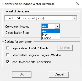 The converter is accessible by clicking on the menu, File > Convert Indoor Database > Vector Database. Then, select OpenDRIVE File Format (.xodr):Figure 1. The Conversion of Indoor Vector Database dialog.