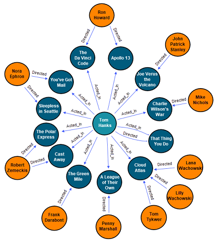 The following diagram shows a graphic representation of nodes and relationship types in the Movies dataset using Tom Hanks, both an actor and director, as an example: