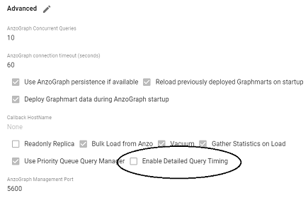 To enable detailed query timing, edit the AnzoGraph connection and select the Enable Detailed Query Timing checkbox. You do not need to restart Anzo or AnzoGraph after changing the setting.
