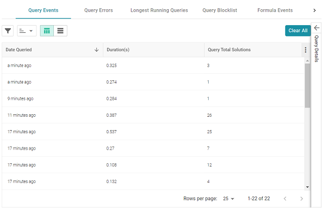 By default, the log shows an overview of all query events for all data sources. The table lists the date queried, the duration in milliseconds, and total number of solutions returned for each query event. You can select an event in the table to view details about that event, such as the target data source and query text, on the right side of the screen.