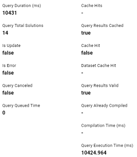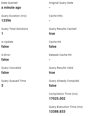 Enable Detailed Query Timing is disabled by default, meaning that Anzo will not run the additional statistics gathering queries unless you enable the setting. When Enable Detailed Query Timing is disabled, the System Query Audit log displays fewer query timing details. For example, the images in the table below show a comparison between the Result Details tab when Enable Detailed Query Timing is disabled versus enabled. When the setting is disabled, details such as query Compilation Time are not recorded.