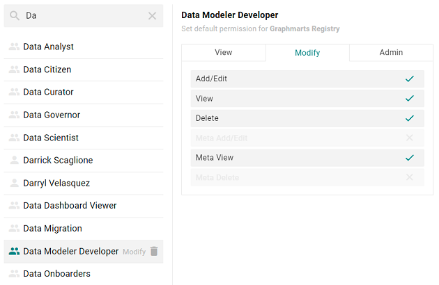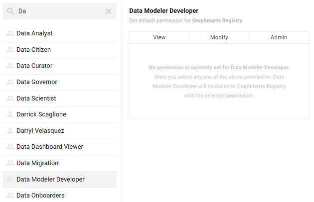 - On the right side of the screen, click the tab for the predefined permission set that you want to assign to the selected user or group. For information about the permission sets, see Default Access Policy Permissions Reference above. For example, the image below assigns the Modify permission set to the Data Modeler Developer group.