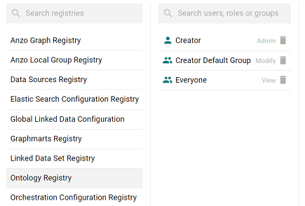 - On the left side of the screen, select the access policy that you want to configure. The current configuration for that policy is shown on the right side of the screen. For example, the image below shows the Ontology Registry. The model creator has Admin permissions, the Everyone role has View permissions, and the Creator Default Group has Modify permissions.