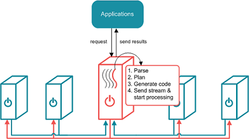 When an application sends a request, the leader node dedicates a thread to process the request. All other threads remain ready for subsequent requests. The leader routes the query through parsing and planning. The planner determines the steps that the query requires, for example, whether a hash join, merge join, or an aggregation step is needed. The planner passes the final query plan to the code generator, which assembles the groups of steps into segments. The code generator then packages all of the segments for the query into a stream. The leader sends the stream to all of the nodes in the cluster and to its own slices. The nodes process the stream in parallel; each node dedicates a thread to process each segment. The nodes then return the results to the leader to send to the application.