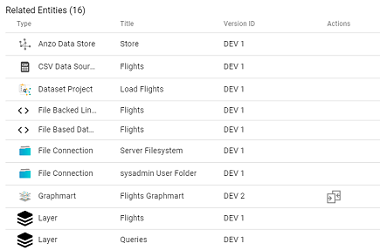 - If necessary, select the new version in the list to view details on the right side of the screen. The screen displays details such as the version creator and created date and lists each of the related entities that were also backed up. In the list of related entities, the Actions column displays a compare icon next to each entity that has changed since the previous version.
