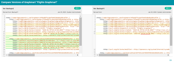 Clicking the icon in the Actions column opens the Compare Versions dialog box, which shows a side-by-side comparison of the TriG files for the two versions: