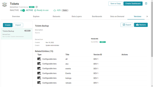 Follow the instructions below to restore an artifact and its related entities to a previous backup version.