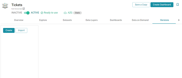 - In the Anzo application, navigate to the artifact that you want to back up, and then click the Versions tab. For example, the image below shows the Versions tab for a graphmart. In this example, the graphmart does not have any backup versions: