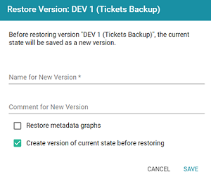 - If you want Anzo to make a backup copy of the current version before restoring it, leave the Create version of current state before restoring checkbox selected.