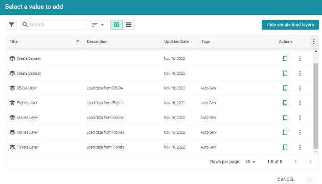 - click Add and select Add Existing. Anzo opens the Select a value to add dialog box, which lists the existing layers for all graphmarts. For example: