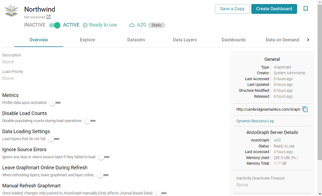 - Click the name of the graphmart that you want to add a layer to. The Overview tab is displayed. For example: