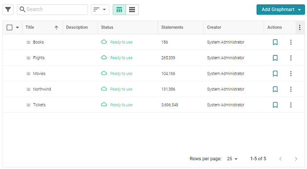 - In the Anzo application, expand the Blend menu and click Graphmarts. Anzo displays a list of the existing graphmarts. For example: