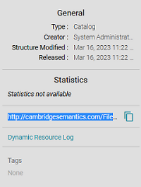 Anzo displays dataset details on the Overview screen for the dataset. To view and copy a dataset URI, go to the Overview tab for the dataset. The URI is under General information on the right side of the screen. You can click the clipboard icon () to copy the URI.