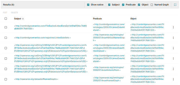 5. In the Subject field in the results, look for a URI that begins with http://openanzo.org/catEntry. The value is the catalog entry URI for the LDS. For example: