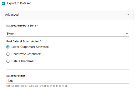 - Post Dataset Export Action: This required setting specifies how to treat the graphmart after the Export Step is processed. To leave the graphmart online, select Leave Graphmart Activated (the default value). To retain the graphmart but disable it and remove the data from AnzoGraph, select Deactivate Graphmart. And to designate the graphmart as temporary and remove it after the dataset is exported, select Delete Graphmart.
