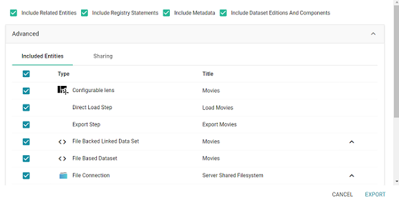 - Include Related Entities: Indicates whether to export the artifact's related entities. Since most artifacts have dependencies with other artifacts, Cambridge Semantics recommends that you enable Include Related Entities (selected by default) and export all related entities. The number and type of related entities that are included varies by the type of artifact that is being exported.