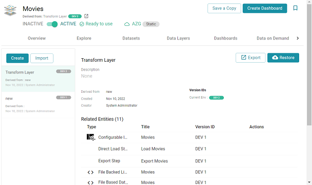 - If you want to export a backup version of the artifact, click the Versions tab, which lists the backups that exist for the artifact. Select the version that you want to export and then click the Export button. For example, the image below shows the Versions tab for a graphmart: