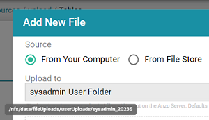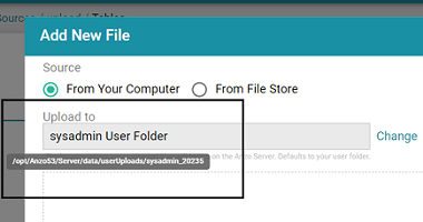By default, if a user uploads a file (such as a CSV, XML, or JSON file) to a data source from their computer, Anzo is configured to copy the file to the server's data directory, <install_path>/Anzo/Server/data/userUploads. This is the path that is selected by default in the Upload To field on the Add New File screen. For example, the image below shows the default upload path for the sysadmin user: