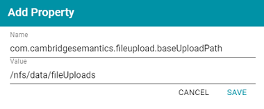 - In the Name field, specify com.cambridgesemantics.fileupload.baseUploadPath, and then set the Value to the location on the file store where uploaded files should be saved. The base directory that you specify must exist on the file store. For example: