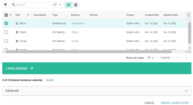 - Select the checkbox next to the data source that you want to add to the graphmart. (Users with the Batch Direct Data Loading permission can select multiple sources.) The selected schema or schemas are shown at the bottom of the screen. For example, in the image a below, a source with two schema instances is selected.