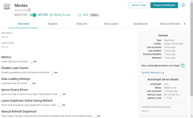 - Click the name of the graphmart that you want to add the data source to. The Overview is displayed. For example:
