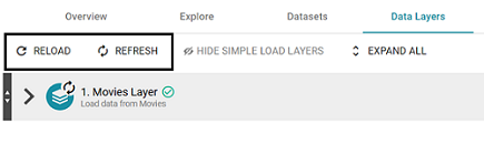 The Refresh option becomes available when changes have been made to one or more data layers. Clicking Refresh resets (deletes from AnzoGraph) and reloads only the data layers that have changed. Clicking Reload resets and reloads the entire graphmart to AnzoGraph, including the data layers that have not changed.