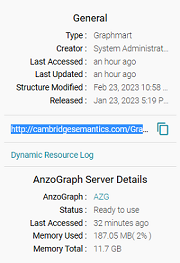Anzo displays graphmart details on the Overview screen for the graphmart. To view and copy a graphmart URI, go to the Overview tab for the graphmart. The URI is under General information on the right side of the screen. You can click the clipboard icon (