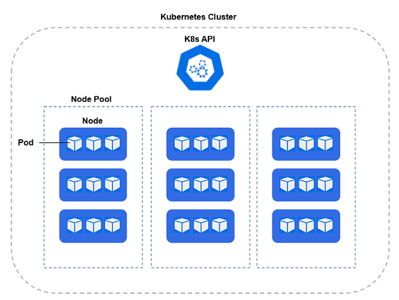 In the cluster, you create a number of node pools or node groups. A node pool or node group is a group of nodes within a cluster that all have the same configuration. Different node pools are designed based on machine types and specific properties to be set on each node. The nodes are tuned to host a particular type of pod. A pod is an instance of an application, i.e., a container of images. The diagram below shows a high level view of a K8s cluster: