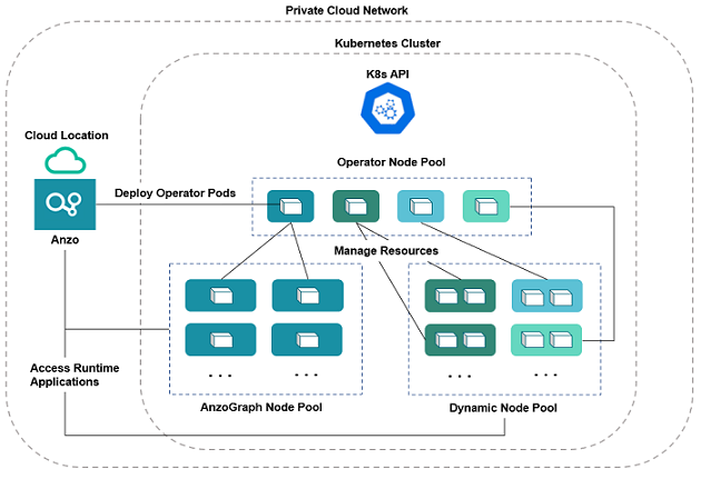 An Operator node pool is tuned to run operator pods. Operator pods manage the application pods and control the K8s resources of the applications that are deployed in the node pools. There is one operator for each application: AnzoGraph, Elasticsearch, and Anzo Agent and Anzo Unstructured. Anzo deploys and manages the operator pods. With the help of the operators, Anzo orchestrates the provisioning and deprovisioning of the application nodes and pods. Since the operators in the Operator node pool are required to be active at all times, operator pods are designed to be very small and use very few resources. They can be deployed on standard, small-sized cloud instances.