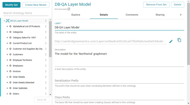 - On the Manage Working Set screen, select the checkbox next to the model that you want to download, and then click OK. Anzo opens the selected model in the editor. For example: