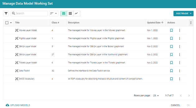 - In the Anzo application, click Model. Anzo displays the Manage Data Model Working Set screen. For example: