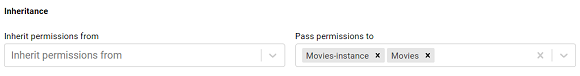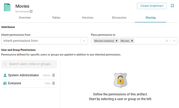 You can also configure an artifact to Pass permissions to other artifacts. In the example above, the Movies data source passes permissions to the Movies schema instance and the Movies graphmart.