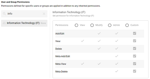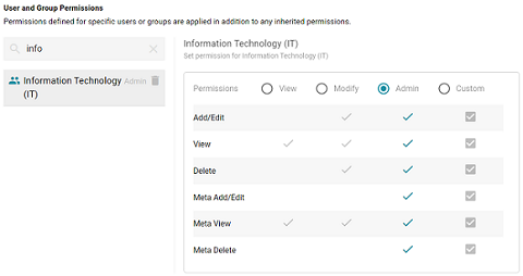 - To assign a predefined set of permissions, click the View, Modify, or Admin radio button to assign that level of access to the selected user or group. Refer to Permission Settings above for details about the permissions sets. For example, the image below gives Admin permissions to users in the IT group: