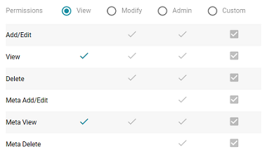 In addition to the View, Meta View, Add/Edit, and Delete permissions described above, the Admin set includes the Meta Add/Edit and Meta Delete permissions described below.