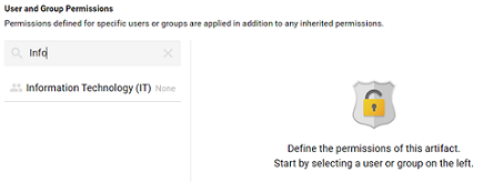 - To share access to this artifact with a particular user or group, type a value in the Search users, roles or groups field to find and display the user or group. The resulting list shows the current permission level that is set for each user or group in the search results. For example, the image below shows the current permissions for the IT group (None):