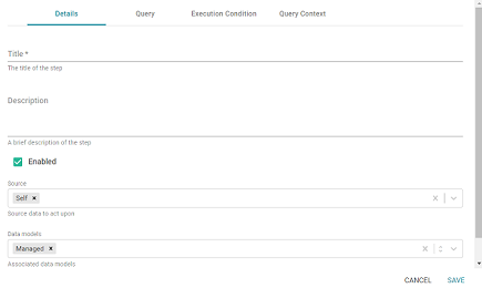 - When you have finished configuring the Details tab, click the Query tab. This tab defines the query that this step should run.