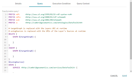 If your query connects to a source that requires input of connection and authorization information, Cambridge Semantics recommends that you do not include the connection and authorization values directly in the query. Instead, replace those values with Context Variables from a Query Context. You can access Context Providers for each data source from the step's Query Context tab. For detailed information about query contexts and referencing variables in a query, see Using Query Contexts.