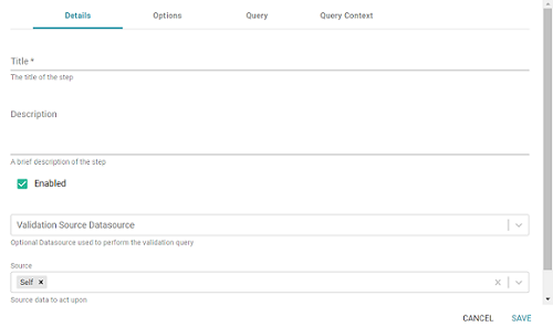 Once the Details tab is configured and the validation options and query are defined, the step can be run. For information about setting up an execution condition that uses this step, see Defining Execution Conditions.