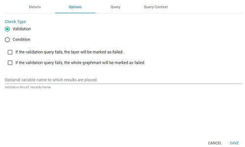 - If you selected the Validation check type, you have the option to configure what to do if the validation query fails:
