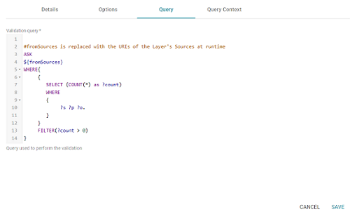 - When you have finished configuring the Options tab, click the Query tab and compose the validation query that the step should run. The tab includes the syntax for writing a SPARQL ASK query, which is useful for determining whether a certain pattern exists in the data. ASK queries return "true" or "false" to indicate whether a solution exists. The template includes a source graph parameter (