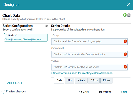 - On the Chart Data screen, click the Add a series link at the bottom of the screen. A new series, named Series 2, is added to the list.