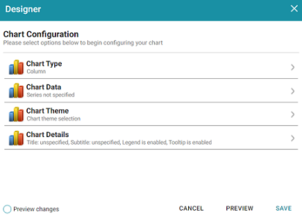 - Click Finish. Anzo displays the Chart Designer, which enables you to configure the type of chart to create, such as column, pie, or line, specify the data that will populate the chart, and customize details such as the chart's theme and fonts, legend, title, and tooltip formats.