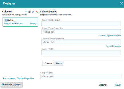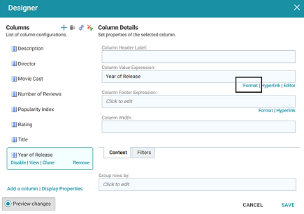 - If you want to make adjustments to the table, such as to reformat the Year of Release column to remove the commas from the values, click the Designer button for the lens. In the Designer, select the Year of Release column, and then click Format under Column Value Expression in the Column Details: