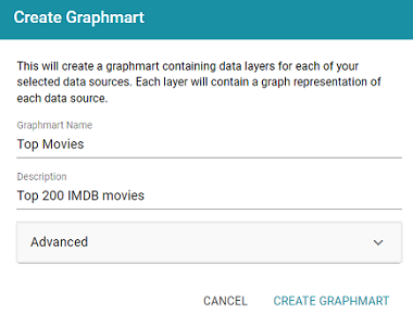 - On the Create Graphmart dialog box, the Graphmart Name is populated with the name of the data source, and the Description is populated with the description from the data source. You can edit either field if necessary. No further configuration is required. For details about the Advanced options that are on this screen, refer to Direct Load Advanced Settings Reference.