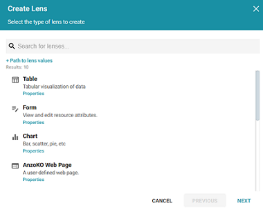 - Select Chart and click Next. Anzo displays the Create Lens dialog box.