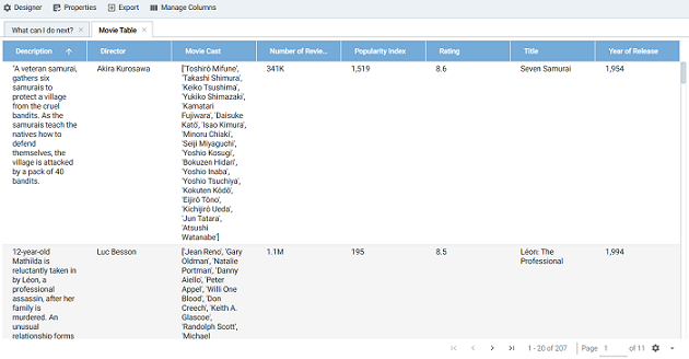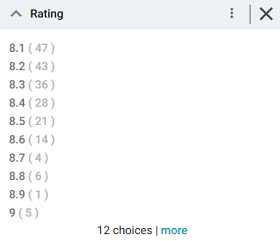 To start to explore the data and see what values exist for the properties in the Top_200_Movies class, it can help to add a filter to the dashboard. Filters reveal the values associated with properties. Learning more about the values enables you to start making decisions about what properties to group on, for example, what properties have relationships, and what results you want to visualize.