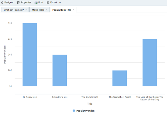 - Click Save. Anzo adds the new Chart lens to the dashboard. To narrow the results that are displayed and filter on one rating at a time, click a rating in the filter. For example, by clicking 9 in the filter, the chart lists the popularity index for the titles that earned the highest rating. Of the highest rated movies, "12 Angry Men" had the highest popularity index:
