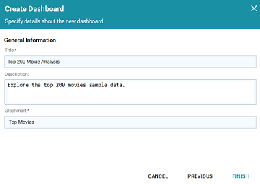 - Select Graphmart Dashboard and click Next. The Create Dashboard dialog box is displayed: