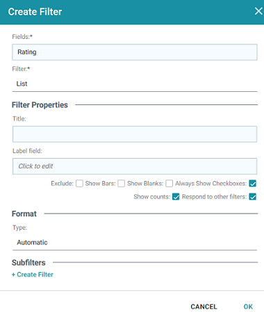 - In the Create Filter dialog box, click the Fields field and browse the available properties. For this tutorial, select Rating, and then click Close to close the Fields drop-down list. Additional options are displayed: