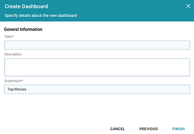 - On the Create Dashboard screen, specify a Title for the dashboard and add an optional Description. Leave the default Graphmart dashboard value in the Type field. For example: